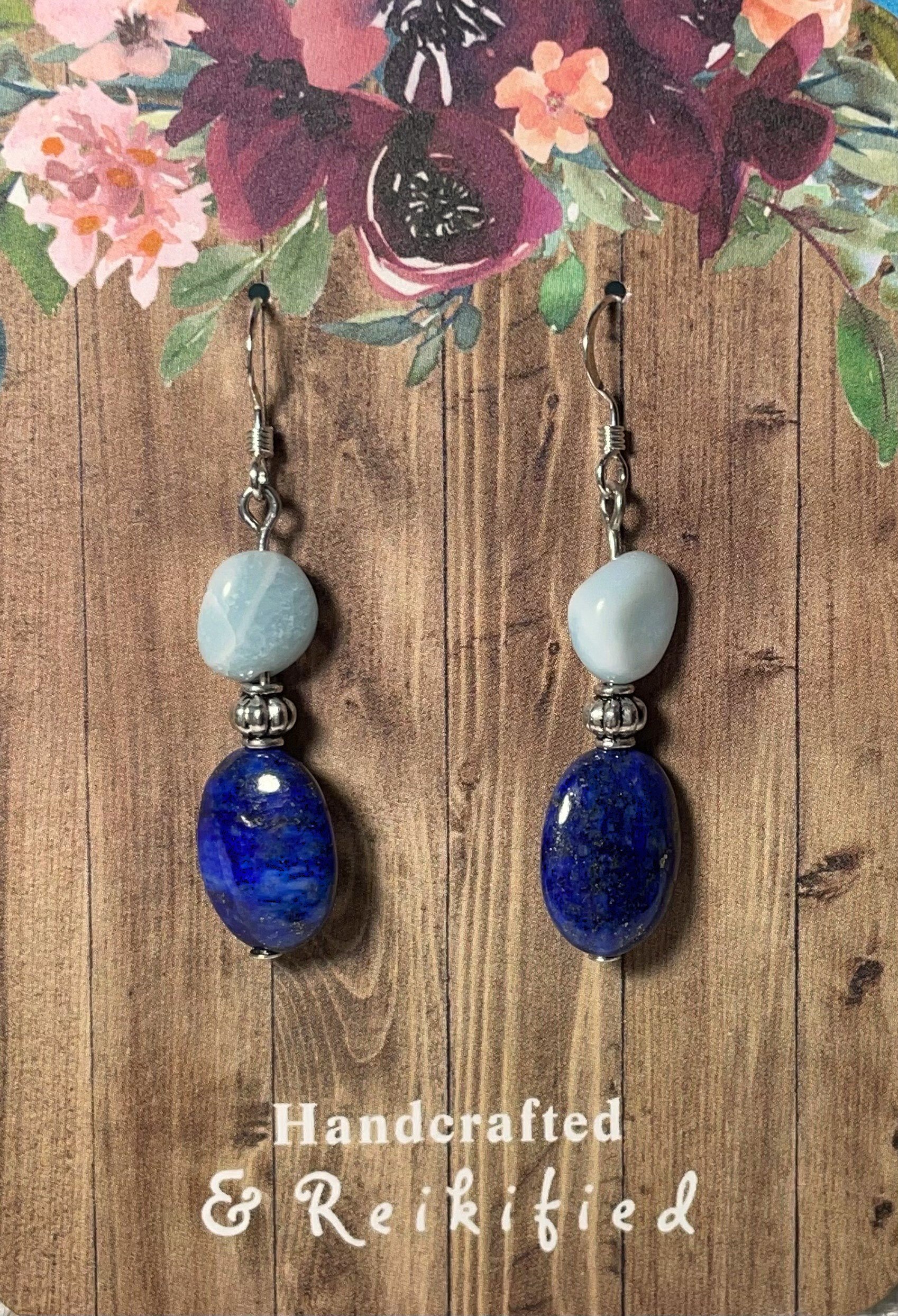 This necklace and earring set feature beautiful Lapis Lazuli oval beads with Amazonite nuggets. Lapis Lazuli, a sacred rich blue stone, symbolizes friendship and truth, encouraging harmony and authenticity in your relationships. Amazonite, pale and milky blue-green, enhances your creativity, self-esteem, and confidence. And the dual feathers featured on the necklace are symbolic of trust, honor, strength, wisdom, power, and freedom.